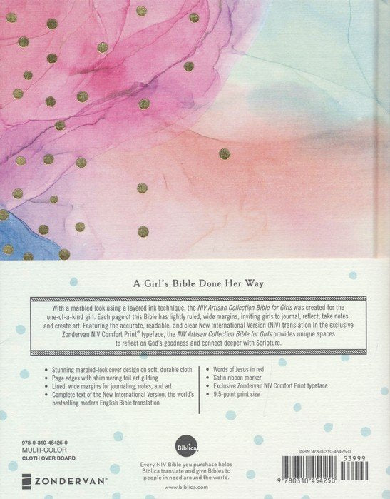With a marbled look using a layered ink technique, the NIV Artisan Collection Bible for Girls was created with girls ages 8 to 12 in mind. Each page of this Bible has lightly ruled, wide margins, inviting girls to journal, reflect, take notes, and create art. Featuring the accurate, readable, and clear New International Version (NIV) translation, the NIV Artisan Collection Bible for Girls provides unique spaces to reflect on God's Word through writing, drawing, doodling or any other way an artsy girl chooses to connect deeper with Scripture! It's a girl's Bible done her way, so that God's Word touches her heart like never before.
