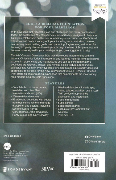 With devotions that reflect the concerns that many couples face today, the bestselling NIV Couples' Devotional Bible is designed to help you build your relationship on the one foundation you can count on: God's Word. The devotions cover many topics, including communication, work and career, sex, money, fears, setting goals, stepparenting, forgiveness, and more. And because it's developed in partnership with the team at Christianity Today International, you can be confident that the devotions are relevant, trusted, and honest.