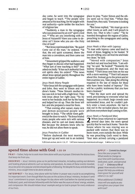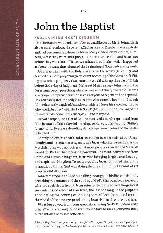 The Courage For Life Study Bible for Men is a strong and rigorous study Bible - featuring a Bible study on every page - for men seeking to demonstrate godly courage and to discover the God who transcends all limitations and transforms anyone who follows him.
