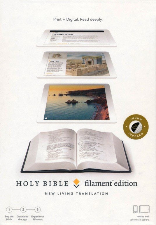 The NLT Filament Bible combines a beautifully printed compact Bible presented in a single column text format with the information-rich capability of the Filament app. Simply scan the page number with your phone or tablet to connect to a wealth of information: study notes, historical character profiles, devotionals, videos, interactive maps, and more - all focused on the specific passage you're reading.