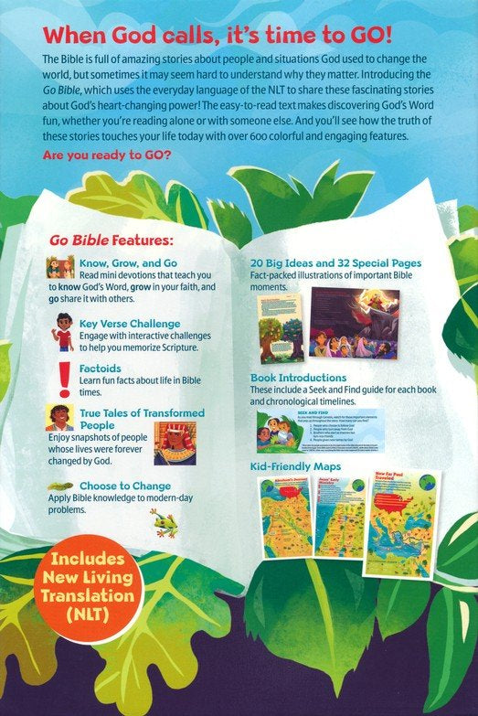 The Go Bible is bursting with fun and engaging content to help kids explore God’s Word and go share it with others. Paired with the accurate, easy-to-read New Living Translation, this kids’ Bible plants seeds of faith and share the life-changing love of God with kids through over 600 features centered on the theme of transformation.