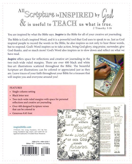The NLT Inspire Bible: The Bible for Coloring & Creative Journaling continues the legacy of the bestselling Inspire Bible series of journaling Bibles. With over 400 unique line-art illustrations spread throughout God's Word to prompt your spirit and imagination, this Bible presents Scripture in a single-column text with wide margins. Custom Scripture art accompanies the most profound and inspirational passages with the intent of sparking your God-given creativity and personalizing the two inch margins with your own thoughts and art. The NLT Inspire Bible: The Bible for Coloring & Creative Journaling is available in the popular New Living Translation, and is designed uniquely to appeal to art-journaling and adult coloring book enthusiasts.