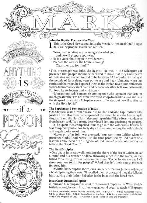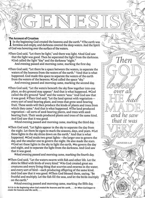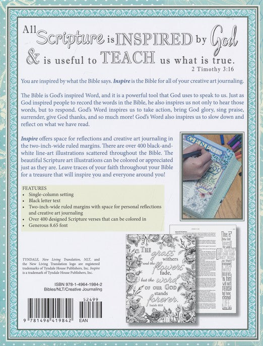 Inspire is a single-column, wide-margin New Living Translation Bible that you'll cherished as a resource for coloring and creative art journaling. It is the first Bible of its kind—with over 400 beautiful line-art illustrations spread throughout the Bible. Full-page and partial-page Scripture art is attractively displayed throughout the Bible, and the illustrations can be colored in to make each Bible unique, colorful, and customizable. Every page of Scripture has two-inch-wide margins, with either Scripture line-art or ruled space for writing notes and reflections, or to draw and create. The generous 8-point font ensures optimal readability, and quality cream Bible paper is great for creative art journaling. Inspire is available in the popular New Living Translation, and is designed uniquely to appeal to art-journaling and adult coloring book enthusiasts.