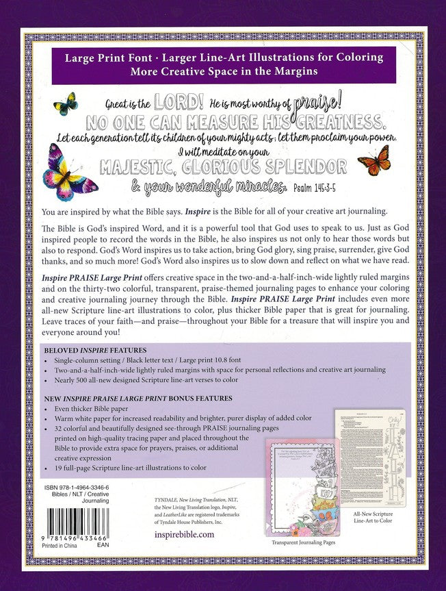 The #1-selling Inspire Bible is a beautiful single-column, wide-margin New Living Translation coloring and creative journaling Bible that has become a treasured legacy Bible for many. The new Inspire PRAISE Bible has even more beautiful line-art illustrations to color, with nearly 500 all-new full and partial-page Scripture illustrations attractively displayed throughout the Bible! Bonus features of the Inspire PRAISE Bible include thicker Bible paper; thirty-two journaling pages, three sheets of PRAISE-themed stickers and a purple pocket in the back of the Bible for storing journaling embellishments. Leave traces of faith-and PRAISE-throughout the Bible for a treasure that will truly inspire!