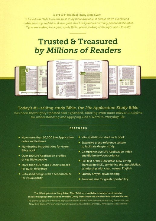 The NLT Life Application Personal-Size Study Bible has been updated and expanded to continue it's 30 year legacy of helping people discover how to apply God's Word to their life today! Now with a fresh two-color interior design and meaningfully updated study notes and features that answer questions you may have about the text, the NLT Life Application Personal-Size Study Bible provides you with practical yet powerful ways to apply the Bible to your life every day. Explore the stories and parables of the Old and New Testaments with verse-by-verse commentary. Survey the big picture of each book through overviews, vital statistics, outlines, and timelines, and grasp difficult concepts using in-text maps, charts, and diagrams-all to help you do life God's way, every day.