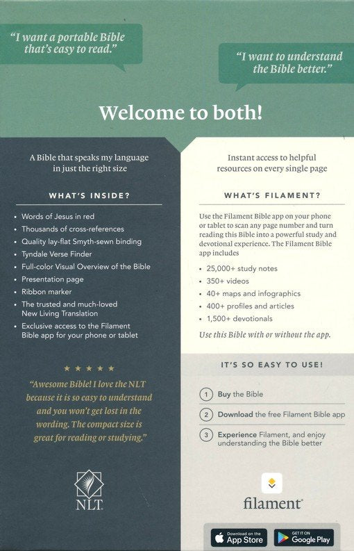 The Filament Bible app turns this Bible into a powerful study and devotional experience, enabling you to use your mobile phone or tablet to connect every page of this Bible to a vast array of related content, including study notes, devotionals, interactive maps, informative videos, and worship music. For no additional cost, purchase, size or weight, you will have access to a wealth of information and resources from the very page you are reading without cluttering up your Bible. Read the NLT Thinline Reference Bible, Filament-Enabled Edition as a reference Bible without the app for convenience or dive into all the free, easily accessible resources from your smartphone or tablet to explore God's Word for an enriching experience of His presence.