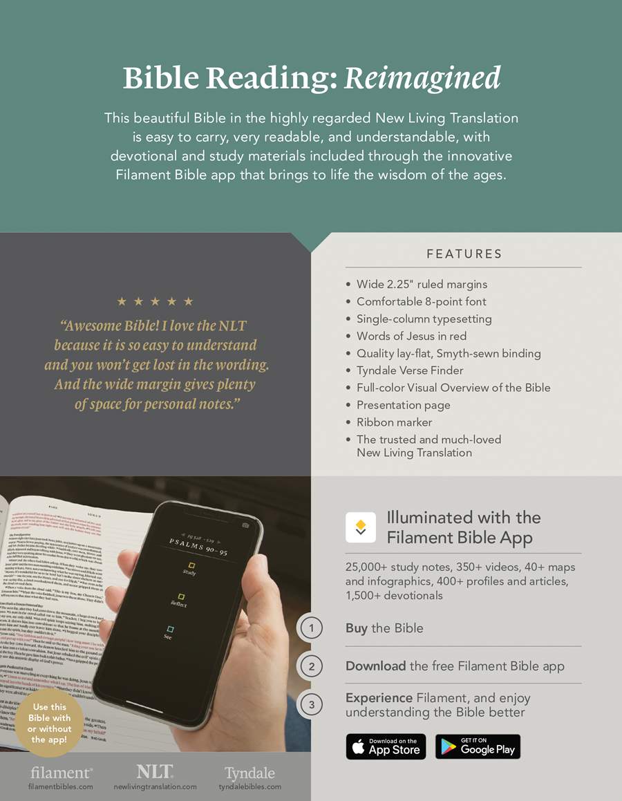 NLT Wide Margin Bible, Filament-Enabled Edition is the only journaling Bible with access to the Filament Bible app, which features thousands of study notes, devotionals, videos, reading plans, and more!