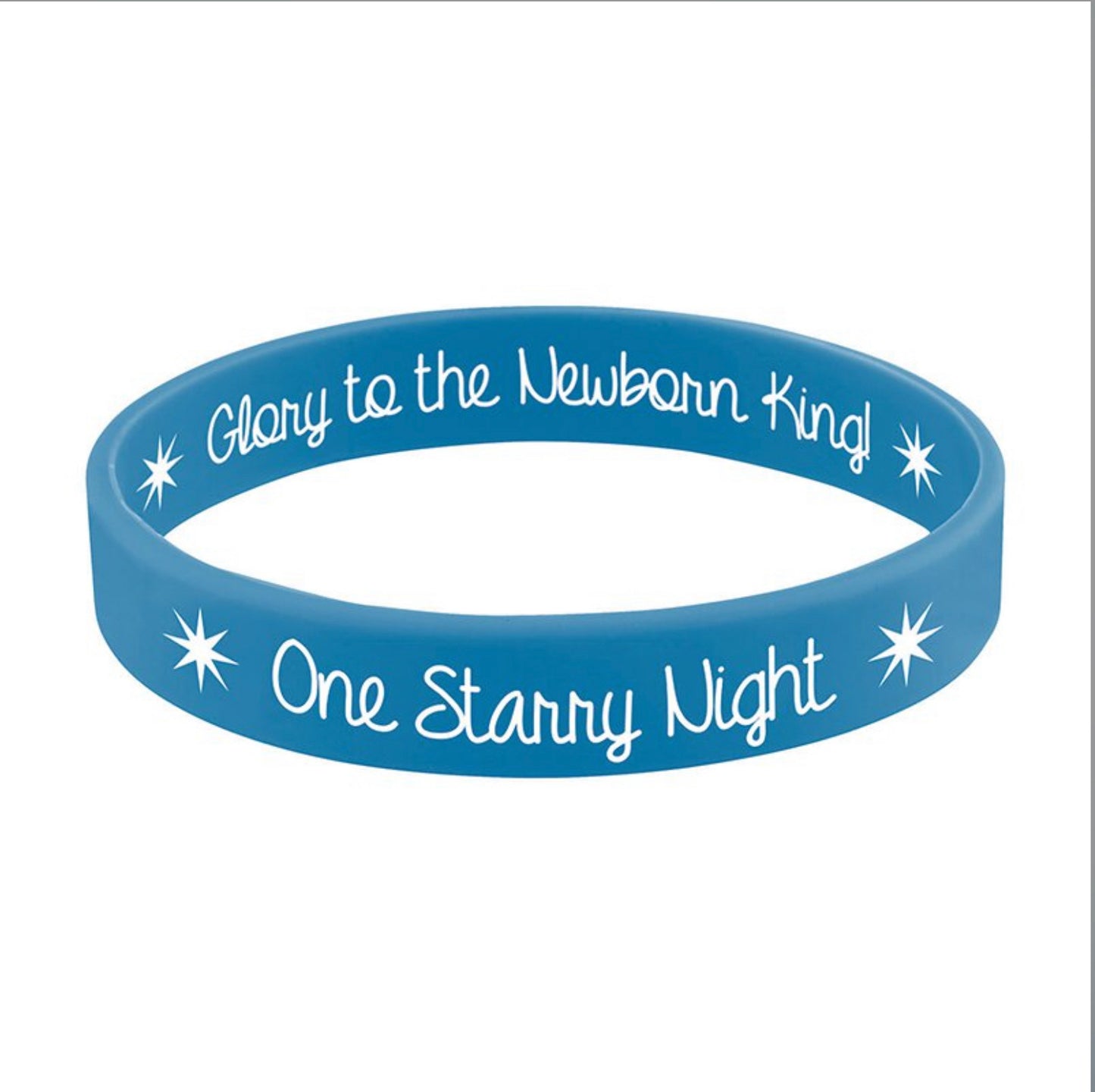 This reversible silicone bracelet comes with the words "One Starry Night" printed on one side and "Glory to the Newborn King!" on the other. Includes a small card featuring the song lyrics to "Hark! The Herald Angels Sing" for kids to follow along.