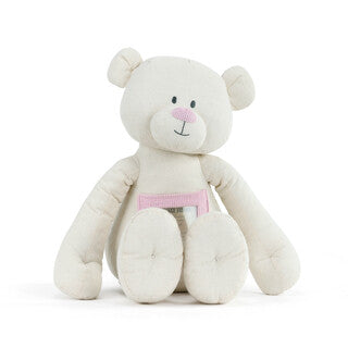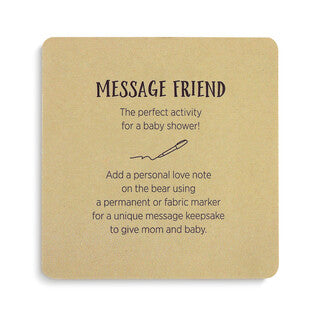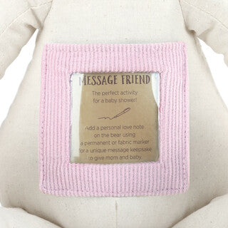 Whether it is a new birth or a first birthday, you can greet the little one properly with a cute gift item from the Welcome to the World Collection. Developed with cuddly keepsakes that are perfect for babies and toddlers, this DEMDACO line is a wonderful way to celebrate early milestones. These cute mementos also include places to store simple messages and photographs of the baby to look over later as they grow up. Create a lovely memory for the little one with the Pink Message Friend. This big cream-colored teddy bear has a clear pocket on his belly and embroidered eyes. The pocket is bordered in pink to imply a baby girl's birth. Write a personal message for your daughter to read when she gets older and store it inside the pocket for safekeeping.