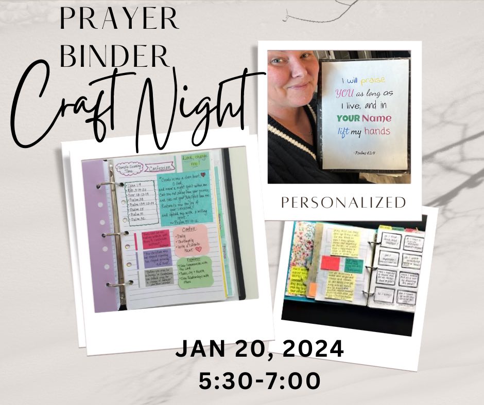 Join us for our Prayer Binder Craft Night and start a new tradition for the New Year. Create a personalized prayer binder to help you stay organized and focused during your prayer time! Develop your prayer practice and make it a part of your daily routine. Let us guide you in crafting something truly meaningful. All supplies will be provided! Please bring a finger food to share!