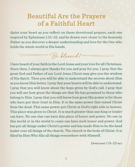 This lovely prayer collection is designed to help you grow in your faith. Dozens of practical and encouraging prayers, each one inspired by Ephesians 1:15-23, will help you strengthen your heart-connection to the Master Creator. Quiet your heart as you reflect on each prayer, and be drawn ever closer to the heavenly Father as you discover a deeper understanding and love for the One who holds the whole world in His hands.