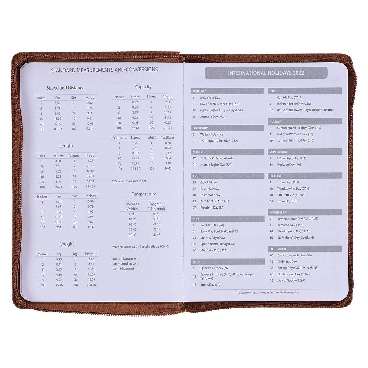 This functional planner is organized using a calendar year that starts in January 2022 and ends in December 2022. Planning can be as detailed as you like by using the daily, weekly, monthly, or yearly schedule pages. Additional handy design features include a budgeting page, pages to capture personal information and contacts information, a worldwide holiday schedule, and world time zones and dialing codes. The back of the planner has ample space for dotted note-taking and also include a Crises Scripture Guide to help you find specific Bible verses. As a bonus, January and February 2023 are included to tide you over until you pick up next year's Executive Planner.