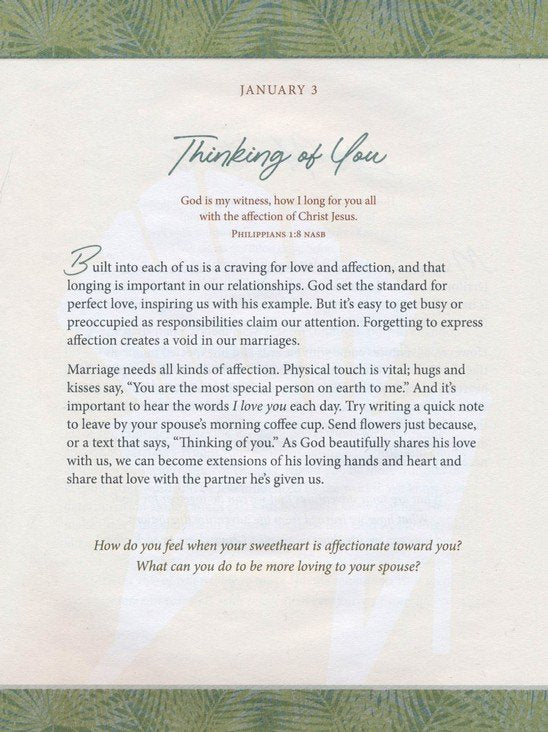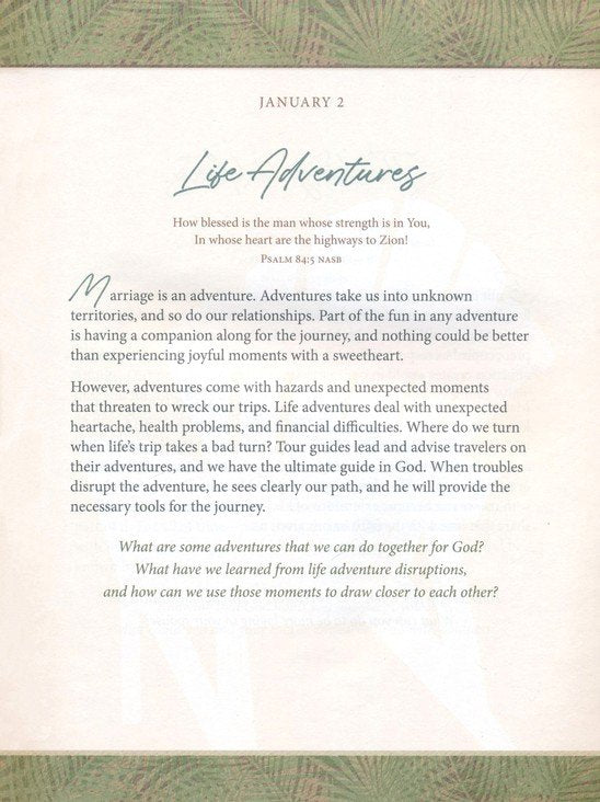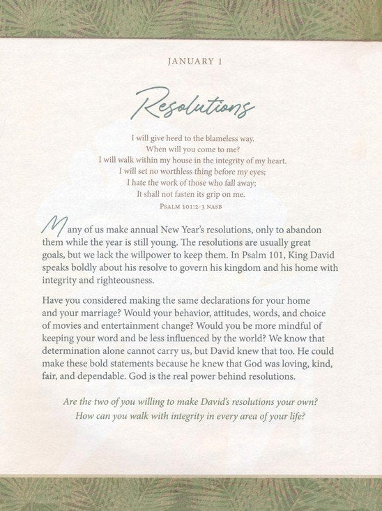 * Want to strengthen your relationship with your spouse? You can walk in confidence when you rely on God to be your foundation. Perfect for gift giving, this handsome devotional helps you prioritize time to grow together with the Lord. Equip yourselves to conquer each new day as a team! 368 pages, tan imitation leather from BroadStreet