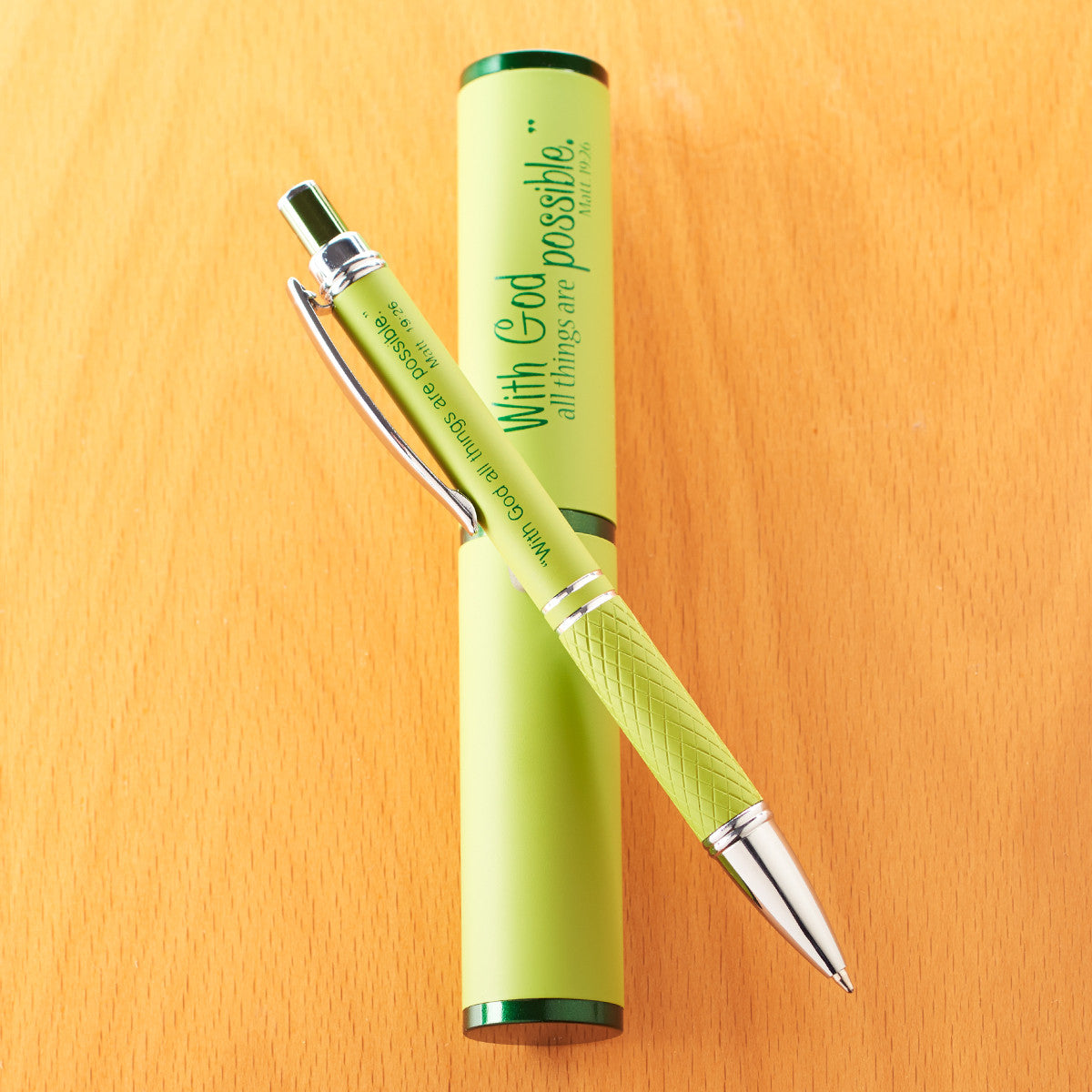 Each pen is encased in a matching barrel. Scripture is screen-printed on both the pen and the barrel. Each color pen is screen printed with a different message.