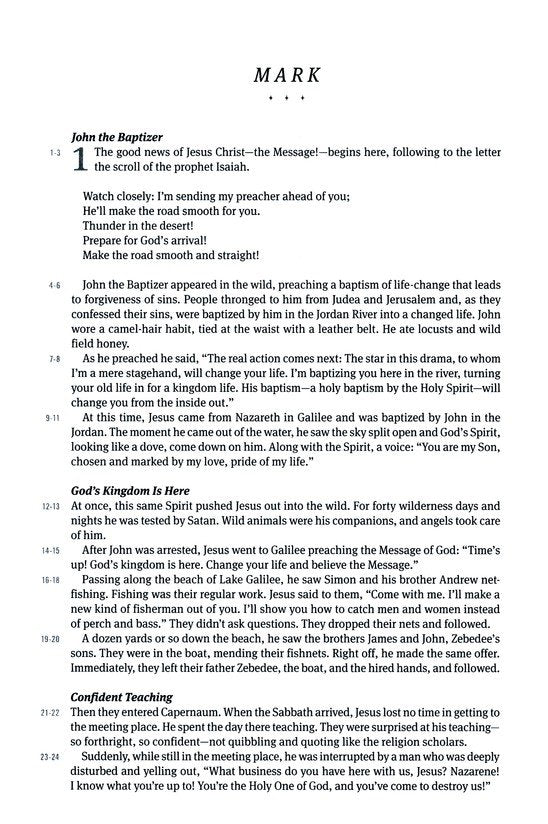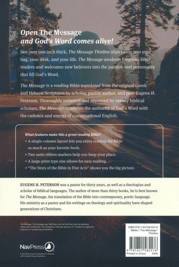 The Message Thinline, Large Print invites you to take God's Word into your hands in a tangible way and feel the substantial spiritual weight of God's truth, hope and love without the burden of a large, heavy Bible. The Message translation brings ancient wisdom from the original biblical languages into our modern and contemporary language and allows people to understand Scripture in a context that they can understand.