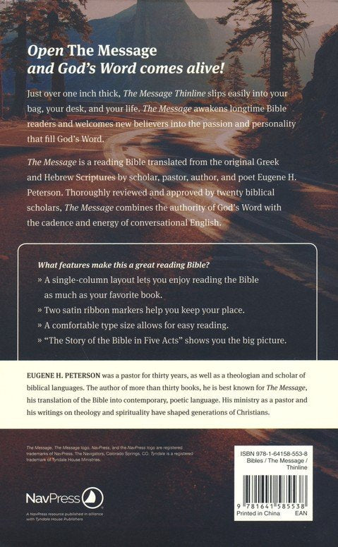 The Message Thinline invites you to take God's Word into your hands in a tangible way and feel the substantial spiritual weight of God's truth, hope and love without the burden of a large, heavy Bible. The Message translation brings ancient wisdom from the original biblical languages into our modern and contemporary language and allows people to understand Scripture in a context that they can understand.