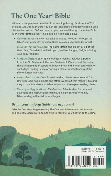 The One Year Bible, which helps you read the entire Bible in one year in as little as 15 minutes a day, has a fresh, new look. The One Year Bible guides readers through God’s Word with daily readings from the Old Testament, New Testament, Psalms, and Proverbs. This edition features the clear and understandable New Living Translation.