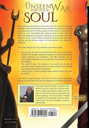 The second edition of The Unseen War for your soul adds clarity and fulfillment to God's mind, will and intentions. There is one verse of scripture that is very astonishing concerning God's will. Amos 3:7: Surely the Lord GOD will do nothing, but he reveals his secret to his servants the prophets. This simply says that everything God will do, past, present and future He has gave them to His servants. God's Word is the means in which this has been accomplished. From the first book of Genesis until the last book called Revelation is God's perfect will. The Unseen War for Your Soul has taken these secrets, mysteries from God's Word and arraigned them in a systematic order. First, we first look into eternity past and observe His creative acts. The reader will be amazed at the beautiful revelations of God's intended purposes for man during His acts of past creation. Second, then what really happen at the creation of the heavens, earth and humanity. A shocking character comes from the third heaven. He was heavens star before his rebellion. Third, we are given the divine honor of seeing into eternity future. God's word paints a picture of the worlds to come. We will look into the two places where humanity will live forever. Chapter after chapter, The Unseen War for Your Soul takes you into and through God's secrets and mysteries until they are divinely fulfilled. This book answers in detail why God created angels and the role they play. Several chapters give a total understanding of angels. Why God created cherubim's, their order in eternity and time. Why evil, its origins and final exit into eternity. Why did God create the human race? I have left no stone covered concerning our creation, purpose, accountability and final judgment. What God gave angels and humanity so His divine will is perfectly fulfilled? Chapter two and chapter twenty two I feel was divinely imparted to me and will answer many questions for those who seek truth. There may be men and women who have preached and wrote along these lines; but I have never heard or read them. This book is a divine miracle that Jesus helped me write and arraigned for His people. There will be many men and women whose understanding will be opened as they read. I give all the praise, honor and glory to my God and savior Jesus for this book.