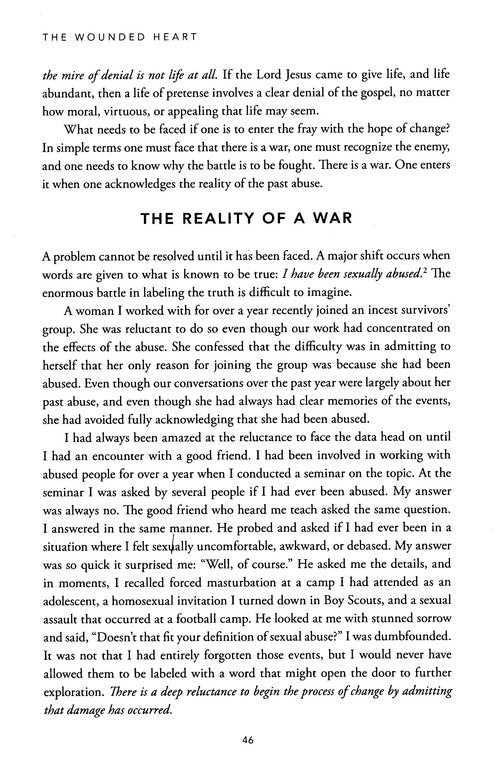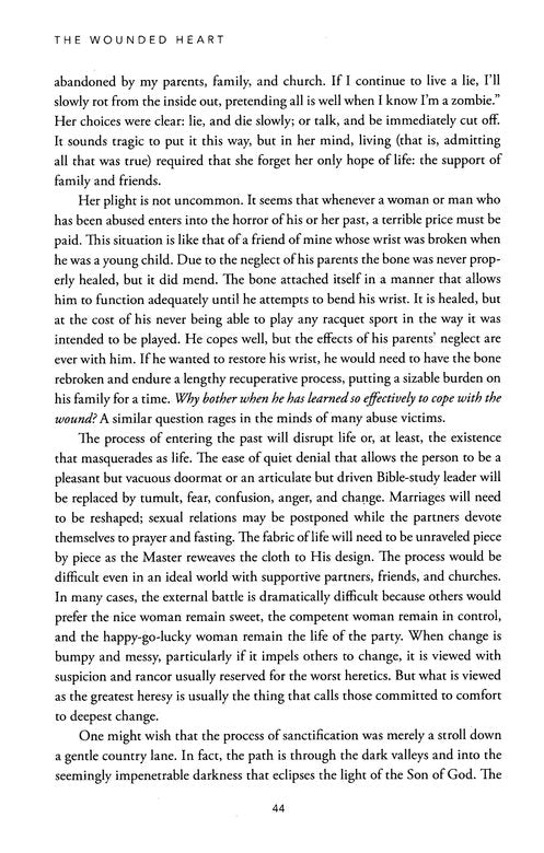 In a world ravaged by sexual abuse, the author offers an urgently needed word of grace. Now with a companion workbook (SKU: 063084) and a new introduction, The Wounded Heart continues to help victims heal from their experience and learn to love boldly in defiance of their trauma. Foreword by Dr. Larry Crabb.