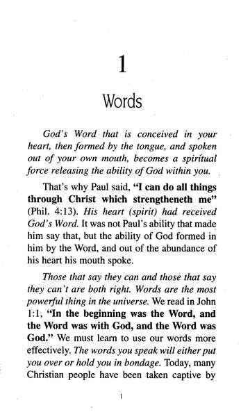 Words are the most powerful things in the universe! The words you speak will either put you over in life or hold you in bondage, and the absence of God's Word in your life will rob you of faith in His ability. Put yourself in a position to receive God's best for you by speaking His Word. God's creative power is still just as it was in the beginning of time when He stood there and said, "Light---be," and light was. His Word spoken from your mouth and conceived in your heart becomes a spiritual force releasing His ability within you. Learn