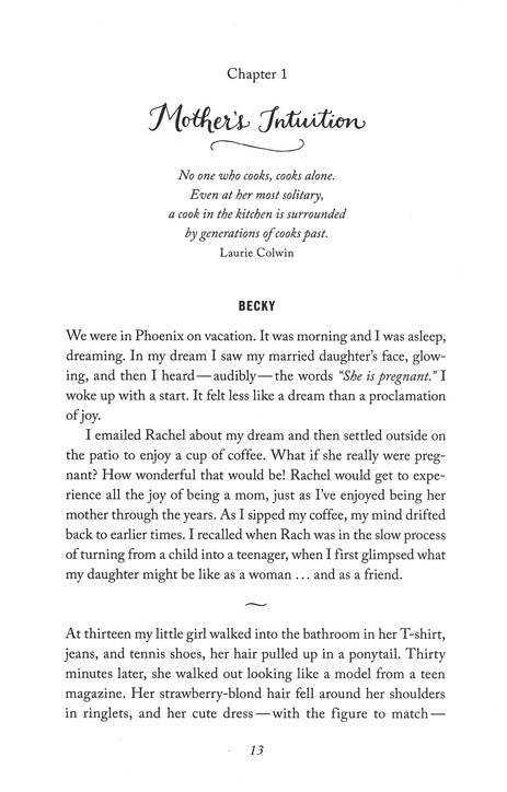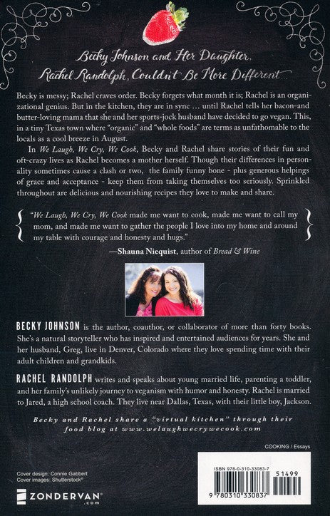 In We Love, We Laugh, We Cook, Becky---a butter and bacon loving mama---and Rachel---a vegan bean eating daughter---share stories of their crazy, wonderful, and sometimes challenging lives as Rachel becomes a mother herself. From food for a family reunion of thirty, to lunch for a party of one in a high chair, to a hot meal for a sick friend, mother and daughter demonstrate grace, acceptance, and love to others through the bonding gifts of humor, attentive listening, and cooking.whether diners prefer beef or tofu in their stew.
