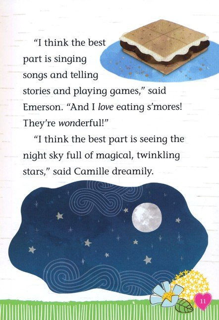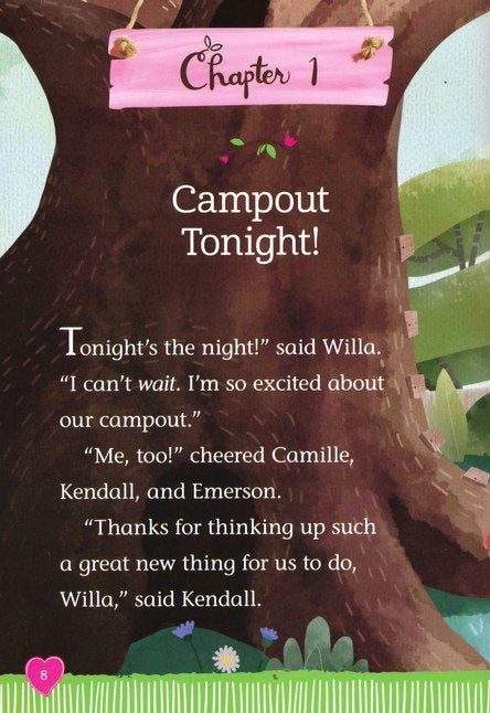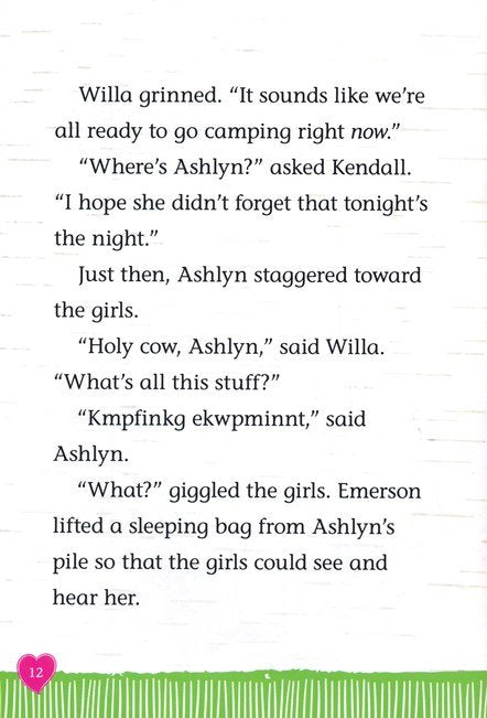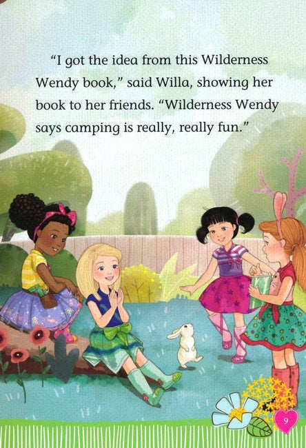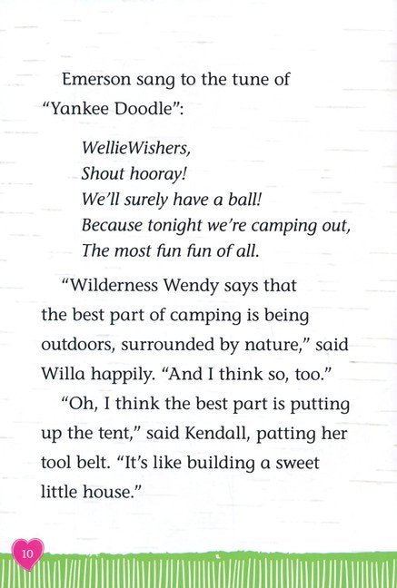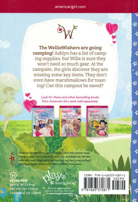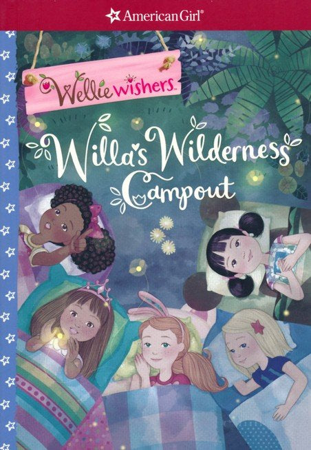 Willa's Wilderness Campout by Valerie Tripp and illustrator, Thu Thai, The Welliewishers are going on a camping trip and are looking forward to sleeping under the stars in this nature adventure. Ashlyn has created a list of camping supplies for their trip, but Willa is certain that they won't need all the gear on this list. As the girls settle in at the campsite, they discover they are missing some things. They don't even have marshmallows for toasting! Just when everyone is sure the trip is turning into a disaster, their friendship saves the day