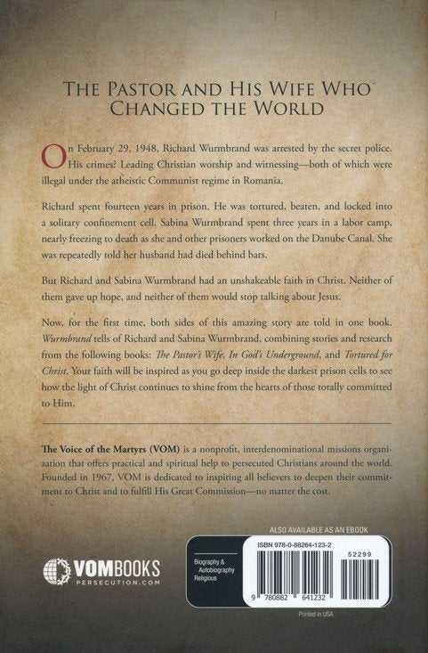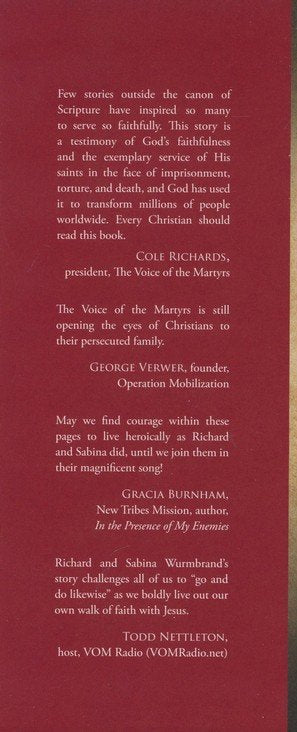 In spite of these hardships, Richard and Sabina had an unshakeable faith in Christ. Wurmbrand explores the inspiring lives of Richard and Sabina urmbrand, combining their complete stories into a single volume for the first time. Your faith will be inspired as you go deep inside the darkest prison cells to see how the light of Christ continues to shine from the hearts of those totally committed to Him.