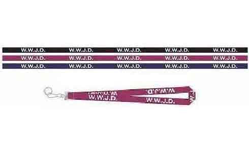 WWJD Lanyards. Woven, Wider Heavier Material name christian badge holder or lanyard, tag holder. Stock colors are Black, Blue, Dark Pink 3/4", for over the neck. 36 inch long